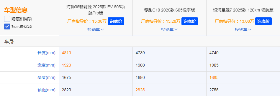 为了和大家聊聊如何选购,我们在这个价位段选出了三台市面上主流的车型,它们分别是指导价15.38万元的海狮06 EV 605领航Pro版,指导价13.28万元的零跑C10 605悦享版,以及指导价13.08万元的吉利银河星舰7 120km领航版: