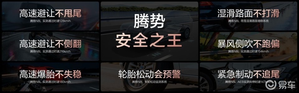 主动安全方面,得益于易三方,腾势N8L能够以128km/h高速避让不甩尾、210km/h高速避让(鱼钩测试)不侧翻、180km/h高速爆胎不失稳、154km/h暴风侧吹不跑偏、147km/h AEB自动紧急制动、不怕雨雪路面打滑、车轮松动监测系统,以科技安全守护家人出行安心。腾势汽车不愧被称为新能源汽车的“安全之王”。