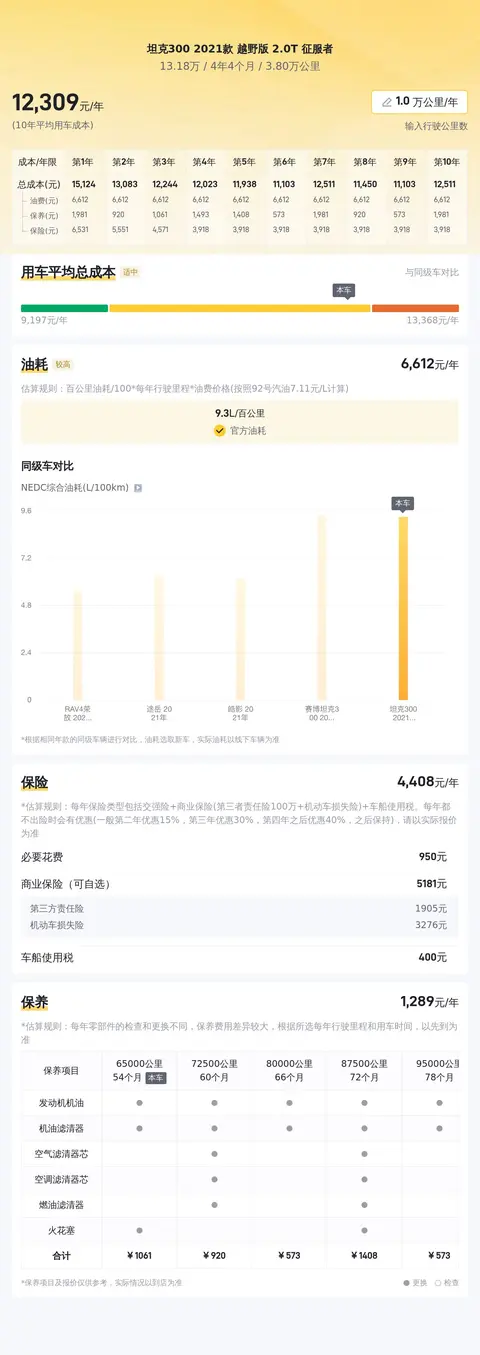 另外,同级车的最低10年平均用车成本是12364元/年,最高是17998元/年,坦克300 2021款 越野版 2.0T 征服者是12364元/年,用车成本适中。