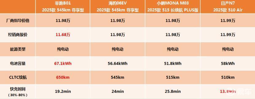 那么,这四款车谁的实力更强,谁更具品价比?为了公平起见,我们对比的这四款车型,价格基本保持一致,值得一提的是,小鹏MONA M03、海豹06 EV、日产N7都没有现金优惠,只是在礼品、充电桩、金融上有一定的优惠,而零跑B01则有3000元的现金优惠,而且还有至高5000元金融补贴以及本品赠换购补贴4000元等权益,优惠力度确实很大。