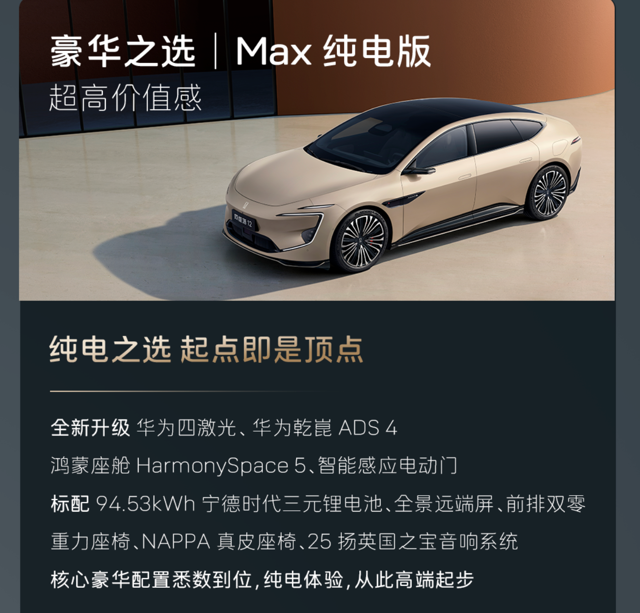 另外,像华为四激光雷达、华为乾崑ADS 4、鸿蒙座舱HarmonySpace 5、前排双零重力座椅、25扬声器英国之宝音响等等都是标配,所以喜欢阿维塔12,但是预算差一点点的话,这个版本完全够用了。