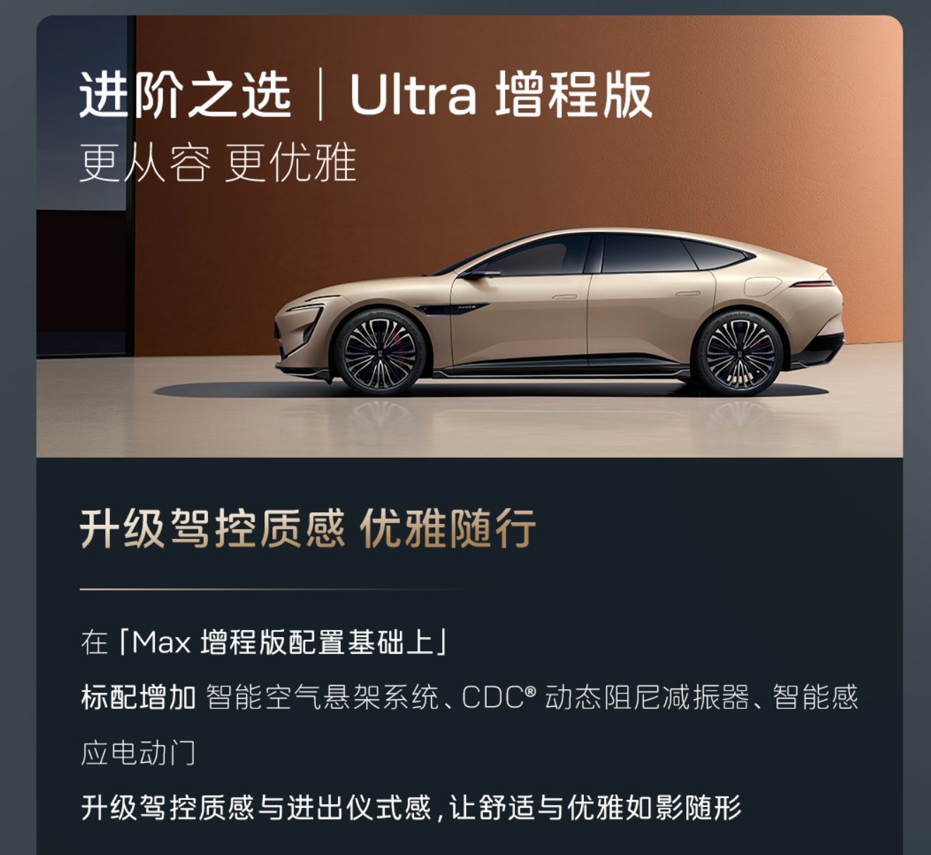 接着就是Ultra增程版,价格比Max增程版贵2万,但是多出了CDC可变魔毯空气悬架,以及智能感应电动门。单从价值来看,和市面上其他新势力产品倒是差不多,主要还是看日常对于行驶的质感要求高不高了。