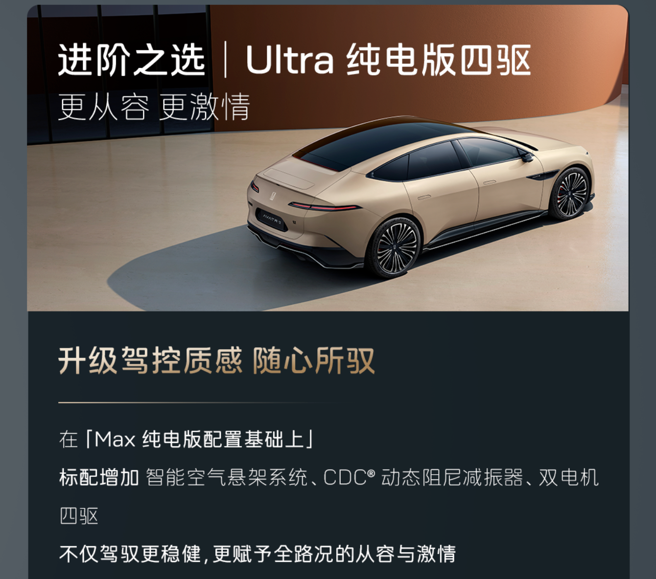 当然,如果你加3万来到Ultra纯电四驱版,在Max纯电版的基础上增加了CDC可变魔毯空气悬架,同时从后驱升级到了双电机四驱,驾驶操控感得到进一步提升。不过对于家用消费者来说,这个必要性不大,完全看个人喜好。