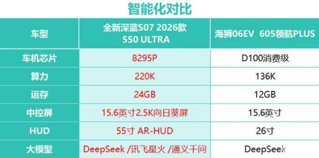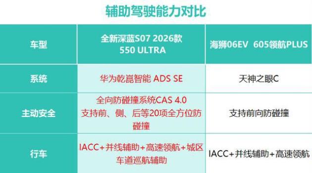 今天我们就以全新深蓝S07 EV 550 ULTRA和海狮06EV 605领航PLUS来做一次产品的对比,让数据说话,看看从三电、安全、智能化、舒适配置和辅助驾驶能力等五个方面,到底这两个车型,哪一个才是更具质价比的选择?看看到底谁才是十五万级诚意满满的大满配?